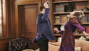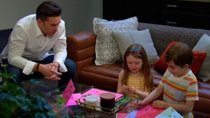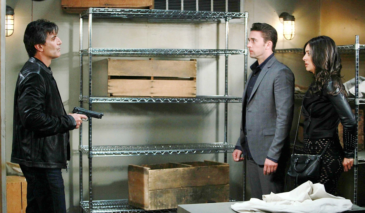 Chad and Gabi hide in a closet at the Kiriakis mansion as Deimos walks in. When they think he is gone, they attempt to flee, but He surprises them at the door with a gun in hand. Deimos demands the Orwell. Gabi gives it back and he asks for the key. Chad and Gabi have no idea what he means. Deimos gets unhinged, and demands it. This goes on a while and Gabi unhooks her necklace and drops it on the floor as Deimos moves them to a sound-proof supply closet elsewhere. Once he gets the key, he'll let them go. He takes their phones and snaps a shot of them to prove they're alive. He locks them in and they scream and pound on the door. Later, Gabi tells him how she and Abigail have been reenacting scenes from "Scooby Doo," in the case of the Orwell device. Chad sighs. He fills her in on Andre's poisoning and Dario's beating. Gabi's in shock and pounds on the door, needing to get to her brother.