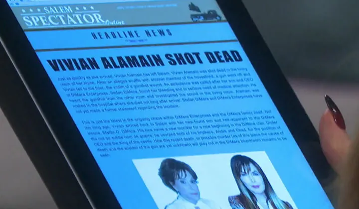 The Salem Spectator is a newspaper in Salem, Illinois founded by the Colville Family in the '80s. Upon her father's death, Diana Colville inherited the company. She eventually sold half the newspaper to Jack Deveraux to kill a story about him. Eventually, Jack blackmailed Diana for the rest. Jennifer Horton began interning at the newspaper when Jack and Diana were co-owners. Vern Scofield became Jack's right hand man around this time. In 2017, Anjelica Deveraux attempted to buy the Spectator from Jennifer and Adrienne Johnson, but Justin Kiriakis helped them acquire the funds to stop her. In 2018, Will Horton became a journalist and investigated the drug that was used to revive him. In 2023, Xander Kiriakis and Gwen Rizczech blackmailed the spectator away from Jack and Jennifer. Later, Gwen sold her half to Chad DiMera. Everett Lynch got a job working as the editor in chief at the spectator, but was fired by Xander due to Chad over his relationship to Stephanie Johnson. In 2024, Xander sold his half back to Jack.