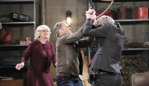 As Stefano and Marlena were in the throes of their lovemaking, she had to get up. John burst and started attacking Stefano, eventually holding him at gunpoint, but Marlena knocked John out from behind. They heard gunfire, and Stefano wanted to see what was going on, but wanted to finish John off first. Marlena said she would do it, and Stefano went back to the main room where he found Brady had been shot.